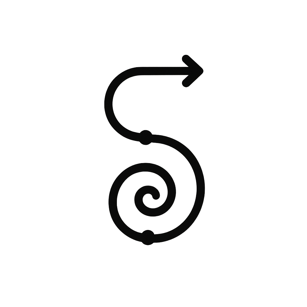 We need an S that can become: S-curve body + spiral at bottom + arrow exit + waypoint dots.